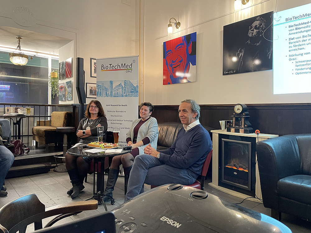 Prof. Robert Krause, Leiter der Klinischen Abteilung für Infektiologie der Medizinischen Universität Graz eröffnete den Abend als Moderator. Gemeinsam mit Prof. Gabriele Berg, Leiterin des Instituts für Umweltbiotechnologie und Prof. Christine Moissl-Eichinger, Professorin für Interaktive Mikrobiomforschung wurden das Mikrobiom im menschlichen Körper, die Einwirkungen u.a. von intensiver Landwirtschaft, Klimaveränderung und Mikroplastik auf die Gesundheit des Menschen und die mögliche Unterstützung durch Probiotika anregend mit den interessierten Gästen diskutiert.